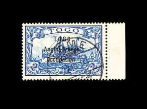 734 O imageS.G. #H11, 1914 "TOGO/Anglo-French/Occupation overprint on 2M Blue, wide setting, a magnificent right sheet-margin used example of this exceedingly rare high value, possessing numerous choice physical characteristics, including excellent centering, intense rich color on fresh white paper, and a neat clean strike of "Lome/Togo/22.10.14." c.d.s. pmk., choice very fine and a highly desirable copy of this rarity; Gibbs notes that only about 40 examples of the normal overprints were printed in this setting, and most known examples are unused, making this even rarer and an exciting opportunity for the used collector; signed Calves and accompanied by 1986 Holcombe certificate (Scott #45; $7,500.00). (Image) £8,500