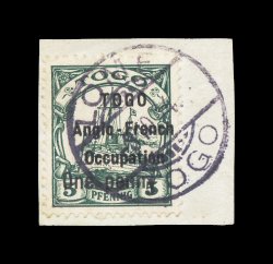 735 O imageS.G. #H13a, 1914 "TOGO/Anglo-French/Occupation/One Penny" surcharge on 5pf Green, wide setting", thin "y" in "Penny", handsome used single tied to piece by "Lome/Togo/8.10.14 ", just a few days after issuance, fresh with deep color, extremely fine variety; 1982 BPA certificate (Scott #34a; $525.00). (Image) £350