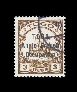 736 O imageS.G. #H14, 1914 "TOGO/Anglo-French/Occupation" overprint on 3pf Brown, narrow setting, pristine used single with portion of 1914 Lome c.d.s., well centered, exceptionally fresh with bright color on clean white paper, choice very fine; Gibbs notes that this is a very rare stamp, despite the fact that most were used, he estimates that only about 25 stamps were issued making this immensely rare and undercataloged; 1979 BPA certificate; ex-Gibbs (Scott #48; $950.00). (Image) £900