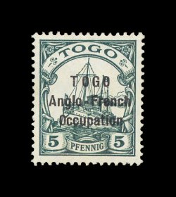 737 ng imageS.G. #H15, 1914 "TOGO/Anglo-French/Occupation" overprint on 5pf Green, narrow setting, perfectly centered unused single, very fresh with bright color on pristine white paper, extremely fine; another underappreciated rarity in unused condition as Gibbs estimates that about 40 stamps were printed in this setting and two thirds of that number were used; signed A. Diena and accompanied by 1992 BPA certificate (Scott #49; $1,400.00). (Image) £1,100