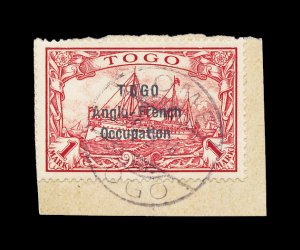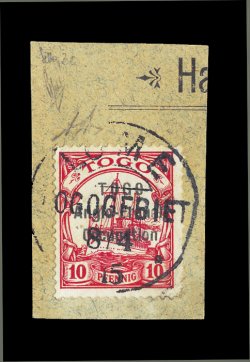 738 O imageS.G. #H16, 1914 "TOGO/Anglo-French/Occupation" overprint on 10pf Carmine, narrow setting, single tied to piece of what appears to be from a commercial cover, "Lome/Togogebiet/8 4 15" c.d.s., very fine; this 10pf in the narrow setting is an incredibly rare issue, Gibbs notes that only fifteen or at the most twenty examples exist, all used, no genuine mint copy has been discovered; signed A. Diena and accompanied by 1989 Holcombe certificate (Scott #50; $2,600.00). (Image) £2,750