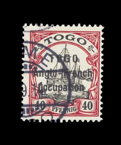 739 O imageS.G. #H20, 1914 "TOGO/Anglo-French/Occupation" overprint on 40pf Black and carmine, narrow setting, fresh used example of this rare value with portion of 1914 Lome pmk., fresh with nice colors and sharp impressions, nearly very fine centering; another rare value of this setting, Gibbs estimates that only about 25 or 30 stamps were issued, most of which were used; 1963 RPS certificate; ex-Gibbs (Scott #54; $1,250.00). (Image) £1,500
