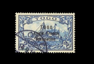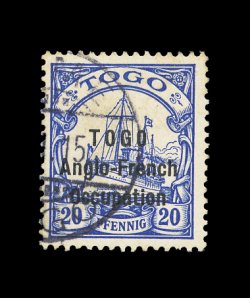 744 O imageS.G. #H32, 1915 "TOGO/Anglo-French/Occupation" overprint on 20pf Ultramarine, third setting, from the Sansane-Mangu find, used single with portion of 1915 Lome c.d.s., well centered and very fine; despite its modest catalog value only 200 stamps were overprinted of this value; 1992 BPA certificate (Scott #64; $600.00). (Image) £475