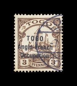 743 O imageS.G. #H29,1915 "TOGO/Anglo-French/Occupation" overprint on 3pf Brown, third setting, used single of this exceptionally rare value, neatly cancelled with portion of Lome c.d.s., well centered and possessing deep luxuriant color on fresh paper, extremely fine; this issue was produced from a find of stamps at Sansane-Mangu, only 50 stamps of this value were allotted to the British for overprinting, Gibbs estimates that only 30 to 40 used examples exist; 1974 Calves and 1998 Holcombe certificates (Scott #61; $3,250.00). (Image) £2,500