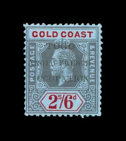 745 og imageS.G. #H43f, 1915 "TOGO/Anglo-French/Occupation" overprint on 2/6 Black and red on blue, "O" omitted from "Occupation", mint single of this scarce variety, fresh bright colors, o.g. being slightly disturbed, very fine (Scott #74 var.). (Image) £475
