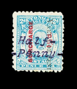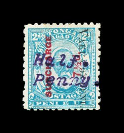 747 ng imageS.G. #36A, 1896 "Half-Penny." surcharge on 1 1/2p on 2p Light blue, Tongan surcharge reading down, unused, small part o.g., fine; 1985 BPA certificate (Scott #36; $325.00). (Image) £450