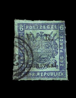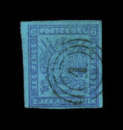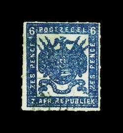 756 O imageS.G. #127b, 1877 "V.R./Transvaal" overprint on 6p Blue on blue, fine rouletted 15 1/2-16, overprint omitted, an extraordinarily attractive example of this enormously rare error, the stamp in this color was printed especially to be overprinted and was not regularly issued without it, this copy has deep color and fresh blue paper, full rouletting on all four sides that are clear of the design, plus neatly cancelled with clear numeral "1" in three-ring cancel, trivial pin-head inclusion cavity at top right mentioned for accuracy, otherwise a very fine example of this rarity; clear 1965 BPA certificate (Scott #82b; $2,700.00). (Image) £2,500
