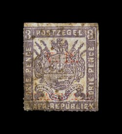 752 O imageS.G. #90, 1877 "V.R./TRANSVAAL." overprint in red on 3p Lilac on pelure paper, fine rouletted 15 1/2-16, position 21 from left pane, used example of this extremely rare rouletted stamp, showing full rouletting at left and bottom and well clear s.e. on top and right, fine example of a stamp missing from most collections; 1977 BPA certificate (Scott #51; $1,700.00). (Image) £1,100