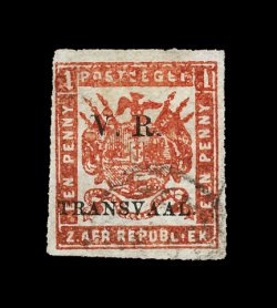 753 O imageS.G. #97, 1977 "V.R./TRANSVAAL." overprint on 1p Orange red on pelure paper, fine rouletted 15 1/2-16, used example of this rare rouletted value with full roulettes on all four sides, well centered for these, light target cancel, diagonal crease at top left, typical of this extremely fragile paper, otherwise very fine; 1994 Holcombe certificate (Scott #58; $1,200.00). (Image) £1,000