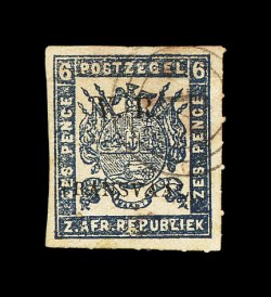 755 O imageS.G. #111, 1877 "V.R./TRANSVAAL." overprint on 6p Dull blue on soft white paper, wide rouletted 6 1/2, well centered used single within quite large margins showing full roulettes at right and bottom, attractive color, light numeral "1" in rings cancel, hinge thin and horizontal crease, very fine appearance; 1989 RPS certificate (Scott #68b; $1,250.00). (Image) £1,100