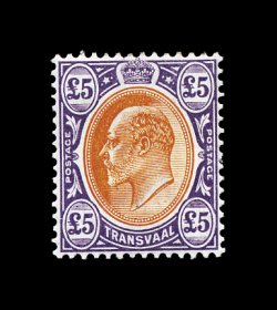 758 og imageS.G. #259, 1903 £5 Orange brown and violet, a gorgeous mint example of this key high value, featuring deep luxuriant colors on crisp white paper, very well centered, o.g., extremely fine and choice (Scott #267; $900.00). (Image) £1,300