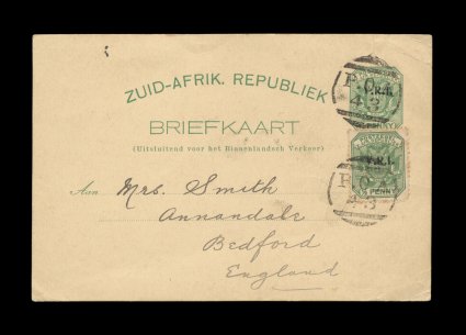 762 c imageS.G. #1, 1900 "V.R.I." overprint on 1/2p Green, tied to legitimately used "V.R.I." overprinted 1/2p Green postal card, this is the same Lydenburg overprint as used on the stamp, card cancelled and stamp tied by two strikes of "P.O.A./43" in bars military cancel, posted to Annandale in Bedford, England, sent by a corporal in the occupying forces reporting his health and location back home, insignificant corner creases to card due to normal postal wear, otherwise very fine; this 1/2p card and a registry envelope were issued at Lydenburg in additition to the stamps, both are great rarities and to find this example legitimately used is a great treat; 1989 BPA certificate (Scott #214). (Image) Est. 750-1,000