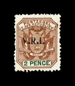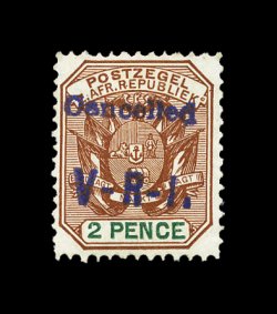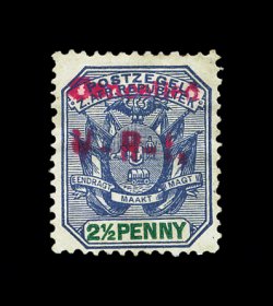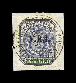 773 og imageS.G. #4, 1900 "Cancelled/V-R-I." handstamped overprint in red on 2 1/2p Blue and green, another rare mint value produced at Wolmaransstad, attractive deep colors, quite well centered, fresh with o.g., h.r., very fine; one of the few certified genuine examples extant; 1960 RPS and 1994 BPA certificates (Scott #240; $2,000.00). (Image) £1,600