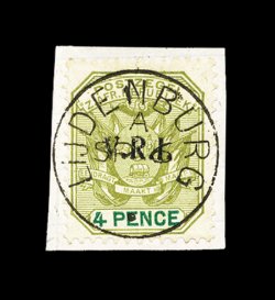 765 O imageS.G. #7, 1900 "V.R.I." overprint on 4p Sage green and green, lovely used example tied to piece by centrally struck "Lijdenburg/SP 6" c.d.s., well centered, fresh and crisp with rich colors, very fine and choice; 1973 RPS certificate (Scott #218; $650.00). (Image) £700