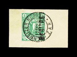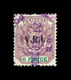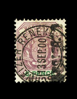 770 O imageS.G. #4, 1900 "BESIEGED" handstamped overprint on 6p Lilac and green, overprint reading up, handsome used single with clear central "Schweizer Renecke/Z.A.R./13. Sep. 00" c.d.s., quite well centered, deep colors, very fine; the key value of this issue; 1990 BPA certificate (Scott #235; $900.00). (Image) £900