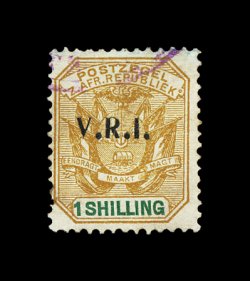 767 O imageS.G. #9, 1900 "V.R.I." overprint on 1/- Ochre and green, a used example of this extremely rare high value, lightly cancelled with portion of violet Army Post Office cancellation at top, attractive colors, light vertical crease at left, fine centering; an unusually difficult stamp that despite the catalog values is probably scarcer used than mint; unpriced used in Scott; signed H. Bloch and accompanied by 1995 BPA certificate ( Scott #220). (Image) £2,500