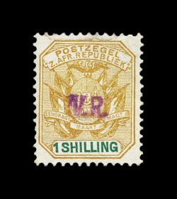 769 og imageS.G. #7, 1900 "V.R." handstamped violet overprint on 1/- Ochre and green, a mint example of this rare value and one of the few certified genuine copies, well centered with fresh colors, disturbed o.g., accompanying certificate states thinned and stained, the staining is light gum soaking in top margin from hinge removal which causes slight translucency, but there is no thinning, still of choice appearance and very fine; a very rare stamp; with "U. of M./Collection" handstamp on the reverse and accompanied by 1987 RPS certificate (Scott #230; $1,300.00). (Image) £1,500