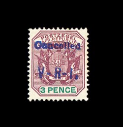 774 og imageS.G. #5, 1900 "Cancelled/V-R-I." handstamped overprint in blue on 3p Purple and green, an exceedingly rare mint example of this value of which there are only a few known certified copies in existence, rather well centered, strong colors and a particularly well struck overprint, slightly disturbed o.g. very fine; an infrequent opportunity to acquire an incredibly rare value of this issue; signed Schlesinger, Kohl and accompanied by 1969 RPS and 1994 BPA certificates (Scott $2,500.00). (Image) £2,750