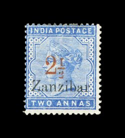 818 og imageS.G. #26(c)j, 1896 "2 1/2" red surcharge Ty. 6, on 2a Pale blue with "Zanzibar" overprint, "1" in "1/2" inverted, mint single of this scarce variety, in addition the "Zanzibar" overprint has the variety of tall second "z", both overprints are clear and sharp, o.g., fine centering; 1991 BPA certificate (Scott #30 var.). (Image) £400+
