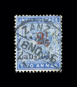 819 O imageS.G. #28(d), 1896 "2 1/2" red surcharge Ty. 8, on 2a Pale blue with "Zanzibar" overprint, used example of this exceptionally scarce surcharge type, in addition "Zanzibar" shows the variety small second "z", central Zanzibar cancel of November 8, 1896, stamp and overprints with deep color combination, very fine; 2002 BPA certificate (Scott #31A; $1,250.00). (Image) £1,800