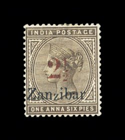 820 og imageS.G. #30(d), 1896 "2 1/2" red surcharge Ty. 7, on 1 1/2a Sepia with "Zanzibar" overprint, well centered mint single, the surcharge is in a brown red shade, and the "Zanzibar" overprint shows the variety short second "z", fresh with rich colors, o.g., h.r., very fine; 1994 BPA certificate (Scott #27; $375.00). (Image) £375