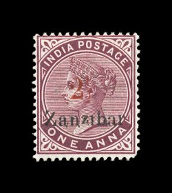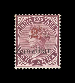 822 og imageS.G. #33(d), 1898 "2 1/2" red surcharge Ty. 4, on 1a Plum with "Zanzibar" overprint, attractive mint single with strong bright color, the "Zanzibar" overprint shows the small second "z" variety, o.g., h.r., very fine; 1993 BPA certificate (Scott #22; $600.00). (Image) £425