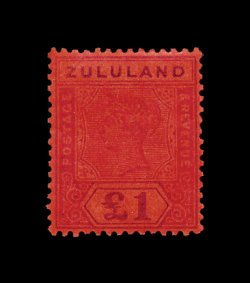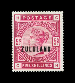 830 nh imageS.G. #11, 1892 "ZULULAND" overprint on 5/- Rose, lovely mint single of this high value, well centered and surrounded by full even perforations, fresh bright color, o.g., never hinged, choice very fine; 1987 APS certificate (Scott #11; $625.00 for hinged). (Image) for hinged £800