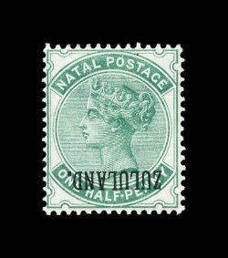 831 og imageS.G. #12b, 1892 "ZULULAND." overprint on 1/2p Dull green, inverted overprint, a choice example of this rare variety, lovely rich color on bright crisp paper, well centered, o.g., lightly hinged, very fine; pristine copy of this difficult error; signed H. Bloch with 1976 Friedl certificate and 1977 PF certificate (Scott #12c; $1,350.00). (Image) £1,200