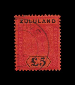 833 O imageS.G. #29, 1894 £5 Purple and black on red, attractive used single of this rare high value, well centered and with crisp portion of Eshowe c.d.s. dated "OC 31 95", paper color is bright and fresh, accompanying certificate states "rubbed surface" which means the violet color is slightly rubbed, we feel this is a bit harsh since this is the normal slight rubbing that occurs on almost all of these, particularly when used, still a very fine and highly desirable used copy of this rarity; 1990 BPA certificate (Scott #24; $1,750.00). (Image) £1,500