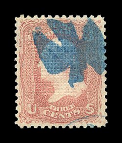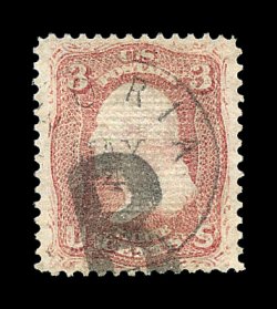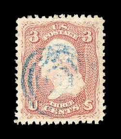 181 O image#83, 3c Rose, "C" grill, the used example offered here is, unquestionably, the finest in existence of this scarce and difficult grilled stamp, possessing physical qualities which are absolutely flawless in every respect, from its mathematically precise centering within lavishly large margins, to its impressively luxuriant color and impression on bright paper, its perforations all around are remarkably even and intact, and its crowning characteristic is its perfectly struck fancy bluebird cancel of Rockford, Ill., this is clearly one of the few existing 19th century stamps deserving of the lofty grade of superb; 1985 and 1994 PF certificates; ex-Welling, Morris. (Image) 1,025.00