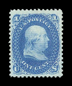 190 og image#86, 1c Blue, "E" grill, an incomparable mint example of this surprisingly scarce and always difficult grilled stamp, possessing overall physical characteristics which are almost unheard of on any of the grilled issues, possessing a breathtaking overall mint "bloom", retaining its original freshness and crispness, with gorgeous intense color and a deeply etched impression, marvelously well centered within extravagantly large margins, full even perforations all around, pristine full o.g. that shows just the barest trace of hinging, extremely fine; a stunning gem for the collector who desires to own only the finest possible quality; arguably the finest original gum example in existence; this remarkable stamp has consistently realized four to five times its then current Scott catalog value when sold in past auction appearances; 1990 PF certificate; ex-Golin. (Image) 3,250.00