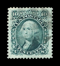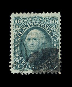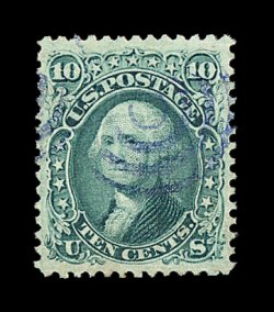 196 O image#89 var., 10c Green, "E" grill, "TAG" transfer variety, a truly superb used example, boasting perfect centering amid lavishly large margins, gloriously rich and vibrant color, excellent clarity of impression on wonderfully bright paper, marvelously postmarked by an ultramarine target cancel, this color being one of the most elusive and desirable of all the colored cancellations to find on any 19th century stamp (not listed in the Scott catalog with this cancel), extremely fine gem; a remarkable combination of centering, margins, overall freshness and cancellation converging on a single stamp; 2003 PF certificate specifically mentioning both the "TAG" transfer variety and the ultramarine cancel. (Image) 300.00+