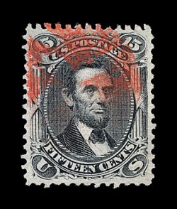 199 O image#91, 15c Black, "E" grill, a sensational used example that is in a quality that cannot be duplicated, as this remarkable stamp possesses physical qualities that would be impressive for any 19th century stamp, but are unheard of on this very scarce and always challenging stamp, beginning with its perfect centering amid lavishly large margins, its color and impression could not be more prooflike on bright white paper, and it has been spectacularly postmarked with a visually stunning red segmented grid cancel at top, superb; a world class gem that is, unquestionably, the finest used Fifteen Cent "E" grill in existence; 2000 PF certificate; ex-Morris. (Image) 725.00