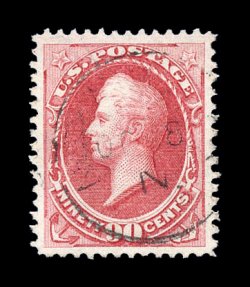 325 O image#166, 90c Rose carmine, a magnificent quality used example of this scarce high value Bank Note, possessing truly extraordinary physical attributes, flawlessly centered amid enormous margins, spectacularly rich and vibrant color that could not be more representative of the Continental printing shade, crisp detailed impression on immaculate paper, even its cancellation is out of the ordinary, being a lightly struck town c.d.s. rather than the usual heavy registry or killer cancels, superb; we dare say that it is unlikely any finer used Ninety Cent Continental Bank Note exists; ex-Renne, Mayer. (Image) 250.00