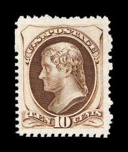 331 og image#172, 10c Pale brown special printing, without gum as issued, a magnificent quality example of the most difficult value of the entire Hard Paper Special Printings series to find in any kind of acceptable quality, with this particular copy being the remarkable exception to the rule, as it features incredibly choice centering within absolutely huge margins, plus we are aware of no other example whose perforations are as fully intact as those found on this stamp, wonderfully fresh overall, with deep luxuriant color and a razor-sharp impression on bright crisp paper, an extremely fine gem in every respect; this is one of the top two existing examples among the approximately 35 to 40 copies of the Ten Cent Hard Paper Special Printings believed to exist; a spectacular stamp that is essential to the collector assembling a gem set of Special Printings; 1957 and 2001 PF certificates; ex-Caspary, Hetherington. (Image) 14,500.00
