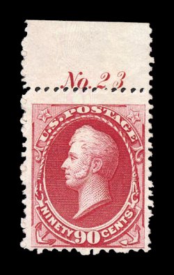 336 og image#177, 90c Violet carmine special printing, without gum as issued, the unique top sheet-margin plate "No. 23" example from the famous Earl of Crawford imprint and plate number strip, possessing an extraordinary overall brilliance, with rich radiant color and a crisp prooflike impression on bright paper, quite well centered, non-scissor separated perforations that are largely intact all around, a very fine and handsome example of this Special Printing rarity; it is estimated that only 40 to 45 examples still exist of the Ninety Cent value; ex-Earl of Crawford, Senator Ackerman and "Concord". (Image) 14,000.00