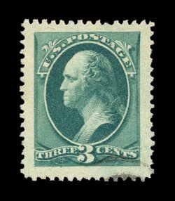 328 og image#169, 3c Blue green special printing, without gum as issued, a select and handsome example of this immensely rare stamp, of which no more than 40 are believed to exist, while centered a bit to right as nearly all known examples are found, this is actually far better centered than most, usual scissor separated perforations, but much more fully intact than usually found, with full or portions of perforations all around (a very rare occurrence), sumptuously rich color and impression, a very fine and choice example a stamp that is missing in even the most advanced collections; 1993 PSE certificate. (Image) 15,000.00