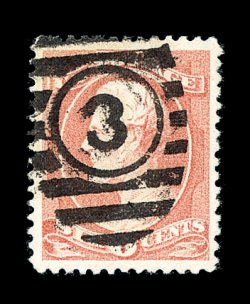 367 O image#208, 6c Rose, unusually large and well balanced margins, particularly strong color and impression on bright paper, bold crisp strike of a barred oval numeral "3" duplex cancel, extremely fine; an elusive stamp to find in gem used condition; 2000 PSE certificate. (Image) 90.00
