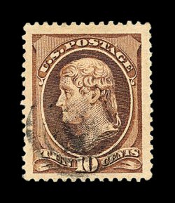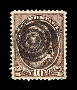 369 O image#209b, 10c Black brown, handsome used example of this scarce and highly distinctive color variety, strikingly intense color in the true blackish brown shade, plus its impression is deeply etched, well centered, central target cancel, very fine; one of the few certified used examples of this we have seen; 2000 PSE certificate. (Image) 200.00
