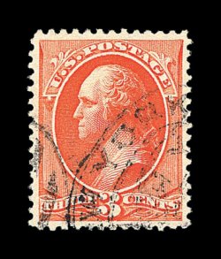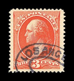 373 O image#214, 3c Vermilion, excellent centering amid extraordinarily wide margins, strikingly intense color and impression on bright paper, neat essentially face-free strike of a Los Angeles double oval postmark, extremely fine; a stamp with great eye-appealing qualities; 2000 PF certificate. (Image) 60.00