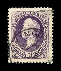 377 O image#218, 90c Purple, an eye-arresting jumbo-margined used example, possessing huge margins all around and being quite well centered within them, warm rich color, light strike of a desirable Washington, D.C. town c.d.s. rather than the more typically seen heavy registry postmarks, extremely fine; 1985 PF certificate. (Image) 250.00
