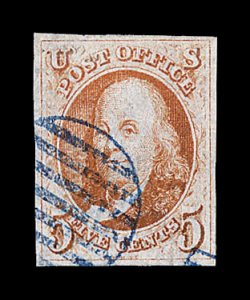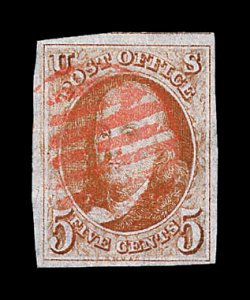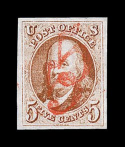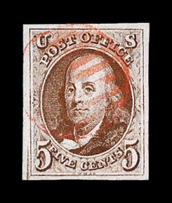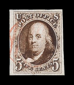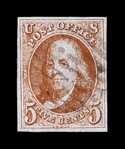 24 O image#1b, 5c Brown orange, an eye-arresting used example of this very scarce and distinctive shade, which is far more elusive than its more often seen orange brown variation which is given the same identification number in the Scott catalog, gorgeous rich and true color, with a highly detailed impression as well, four large and well balanced margins, light and unobtrusive black grid cancel (black postmarks on the first issue are uncommon), extremely fine; a superlative example of the Brown orange shade; 1999 PF certificate. (Image) 1,600.00