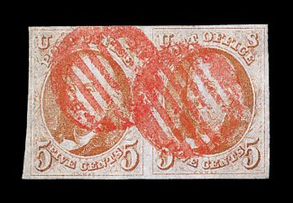 27 O image#1c, 5c Red orange, an incredibly rare horizontal pair of the most elusive and desirable of all the shade varieties found on the Five Cent 1847 Issue, four full to large margins, wonderfully vibrant and unmistakable Red orange color, bold red grid cancels, completely free of the faults that plague the vast majority of the known examples of the Red orange shade, extremely fine; according to the Philatelic Foundation records, only four pairs of the Five Cent Red Orange have been certified, with this pair being one of two that is fault free; 1977 and 1996 PF certificates; ex-Grunin; unlisted in Scott as a pair, cataloged as two singles. (Image) 11,000.00+