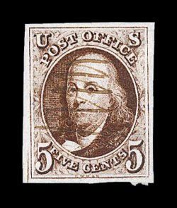 28 O image#1-B, 5c Brown, double transfer Ty. B, position 90R1, a marvelously select example of this double transfer variety, featuring lavishly large and perfectly balanced margins all around. deep rich shade and a highly detailed impression which shows the Ty. B double transfer characteristics exceedingly well, red grid cancel, extremely fine gem; 1999 PF certificate. (Image) 700.00