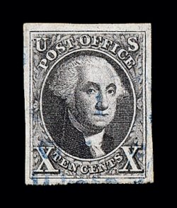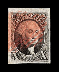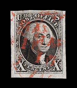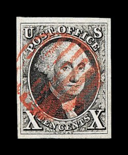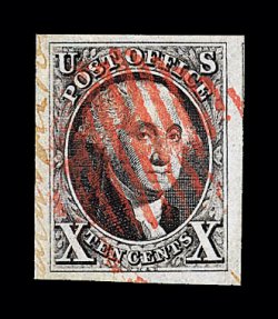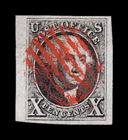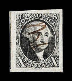31 O image#2, 10c Black, position 3L, gem used example featuring huge margins all around, including a partial sheet margin at top, deep luxuriant color and a strong detailed impression, red grid cancel, extremely fine; a truly outstanding example of the Ten Cent 1847 Issue; 1987 PF certificate. (Image) 1,400.00