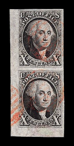 40 O image#2, 10c Black, positions 81/91R1, bottom left corner sheet-margin vertical pair, large to enormous margins all around, with the sheet margins measuring between 3-4mm, intensely rich color and fine detailed impression on deeply blued paper, light and unobtrusive red grid cancels, faint scored line entirely in the very wide sheet margin at bottom, extremely fine. A spectacular pair of extraordinary beauty and rarity. Vertical pairs of the Ten Cent 1847 Issue are decidedly more elusive than horizontal pairs, especially in such outstanding condition. But to find a corner sheet-margin example is a truly remarkable occurrence. In fact, we believe this to be the only corner sheet-margin vertical pair in existence. Even a horizontal pair with a full corner sheet margin, if it indeed exists, would be of equal rarity and desirablity. Being one of the most important 1847 items known, this pair would be perfectly suited either for exhibition or placement in a collection among other great classic United States condition rarities. Accompanied by a 1974 PF certificate. ex-Engel, Klein. (Image) Est. 15,000-20,000