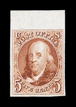 41 og image#3, 5c Red brown reproduction, without gum as issued, a truly superb example, boasting large to enormous margins all around, including a sizable 7mm sheet margin at top, prooflike color and impression on brilliantly fresh paper, an extremely fine gem for the perfectionist; sheet-margin examples of the Five Cent and Ten Cent Reproductions are actually very rare, as the sheet margins of these sheets were normally trimmed off right after printing; 1999 PF certificate. (Image) 725.00