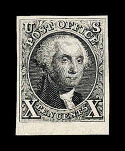 42 og image#4, 10c Black reproduction, without gum as issued, highly select example, possessing large to huge margins, including a 3mm sheet margin at bottom, prooflike color and impression, extremely fine; seldom encountered in this gem quality; 1994 PSE certificate. (Image) 900.00