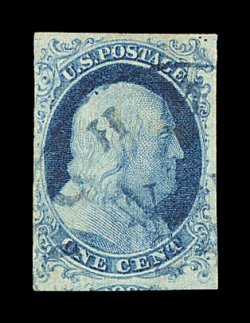 53 O image#8A, 1c Blue, Ty. IIIa, large even margins, extraordinarily color and impression that are both truly prooflike, showing a complete outer line at bottom and a wide break at top, crisp immaculate paper, neat and unobtrusive blue town c.d.s. confined to bottom right, extremely fine; a particularly handsome example of this very scarce type; 1997 PF certificate. (Image) 1,100.00