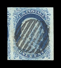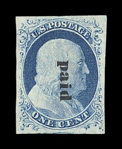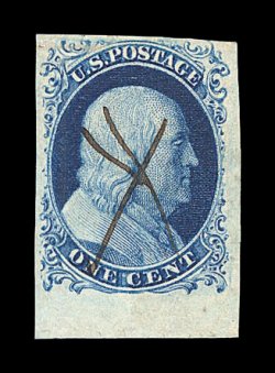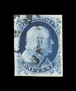 43 O image#5, 1c Blue, Ty. I, position 7R1E, extravagantly large margins virtually all around, showing a portion of the adjoining stamp at bottom, just touched at left, gloriously rich color in the distinctive bright Plate 1 Early shade, excellent clarity of impression on fresh paper, wonderfully postmarked with a light and unobtrusive strike of a blue "Richmond, Va./Nov 24" c.d.s., which in no way obscures the important Ty. I design characteristics at bottom or the double transfer at top right, an extremely fine gem in every regard. A magnificent quality example of one of the rarest and most sought-after classic United States stamps. Only one position (out of a possible 1,000), the legendary position 7R1E, provides the philatelic world with the only full Type I design as originally intended, a characteristic no other One Cent imperforate displays. According to the census compiled and published by Jerome S. Wagshal in 2001, there are only 90 confirmed examples of the imperforate Type I, virtually all of which are used. When one eliminates those found on cover or in multiples, there are a mere 56 examples available to collectors. Of this small population very few are found both with the remarkable physical characteristics this possesses, as well as being completely sound. The narrow spacing between the stamps, and the lack of care taken when separating the stamps for use, has resulted in the paucity of available four-margined copies to collectors. The example offered here from the Hinrichs collection comes from the "Warner strip" of positions 7-9R1E. The strip was intact when it was sold in the 1956 Caspary sale. However, after the Caspary sale, the position 7R1E was carefully separated from the strip with the intent on preserving the remarkable margins this stamp boasts. As a result, this particular example now ranks among the top two or three finest sound examples in existence. One of the great condition rarities of 19th century United States philately. Easily the finest quality example to have come on the market in the past decade. Wagshal Census #5-CAN-047. Accompanied by 1976 and 2001 PF certificates. ex-Caspary, Twigg-Smith. (Image) 45,000.00